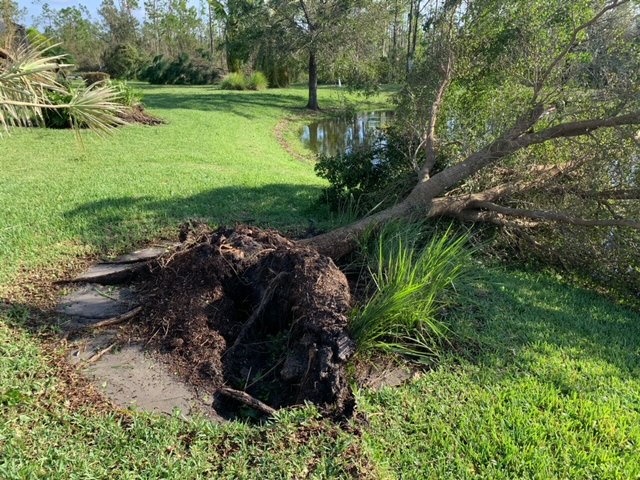 This is our downed tree…taken from just by the date palm at left above and looking the other direction. It’s laying in the pond but was originally blown over by the easterly winds and leaned on the lanai then as the eye passes and the wind reversed it went the other way into the pond. Looking about NNE.