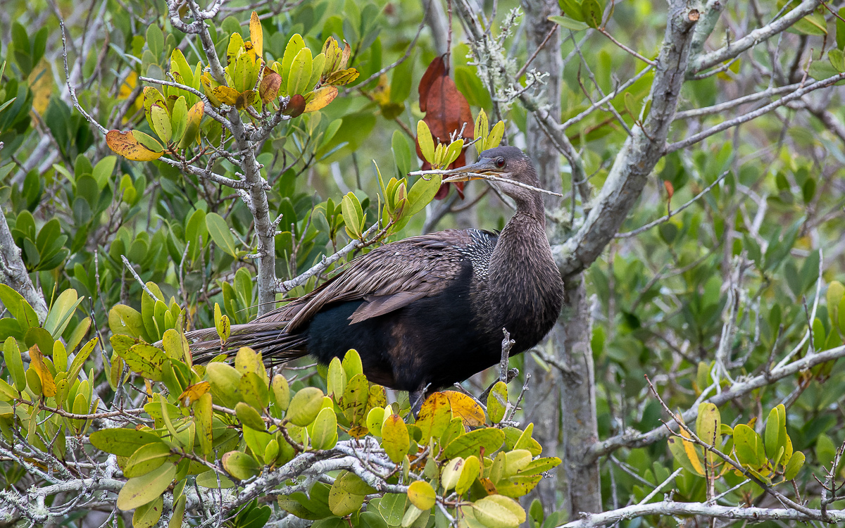 Female Anhinga (rusty brown neck) with some nesting material