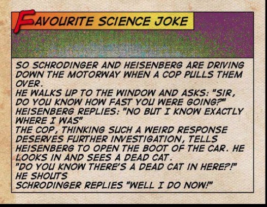 For the non geeks…Schrödinger was the physicist that came up with the quantum mechanics theory that if you put a cat in the box and could not observe it then it could be either alive or dead and you could only know by observing it which would possibly change it’s alive/dead state…he did this as an illustration of one of those quantum mechanics things. Heisenberg was another quantum mechanics physicist who came with the Heisenberg Uncertainty Theory which says you can either know the precise location of the quantum particle or its velocity but that it is impossible to know both.